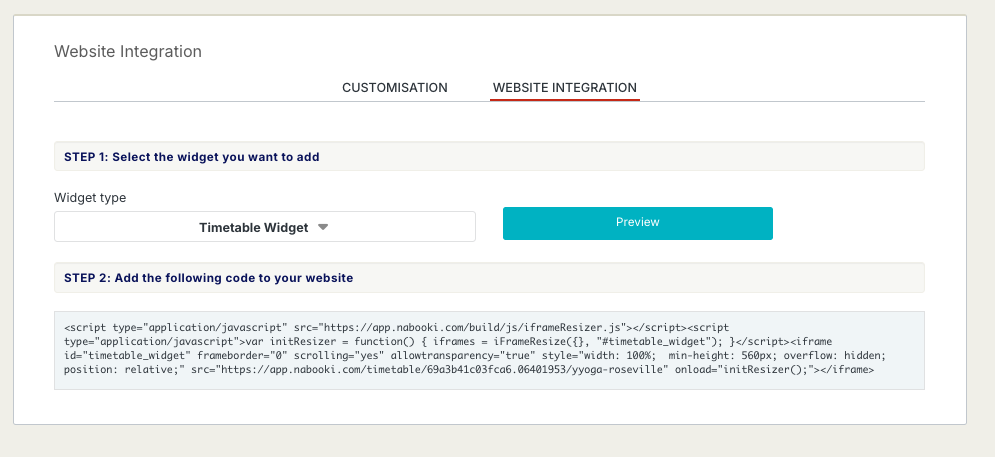 Embed the booking widget to your website You can embed your booking widget to your website in two ways: A full embedded booking tool Book Now button that opens the booking tool when clicked. Both options use an embed code you copy from Nabooki, and ...