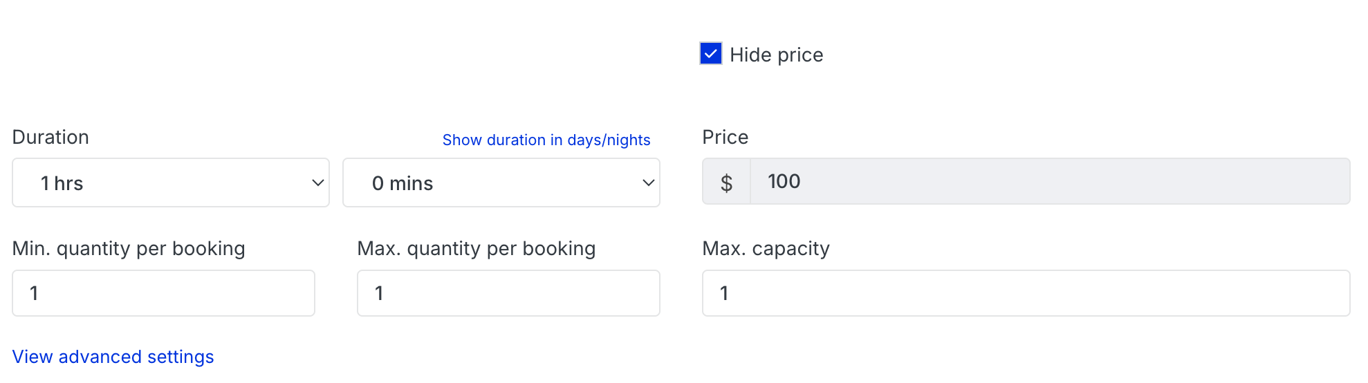 - Hide Price – prevents the price from showing in the booking widget.