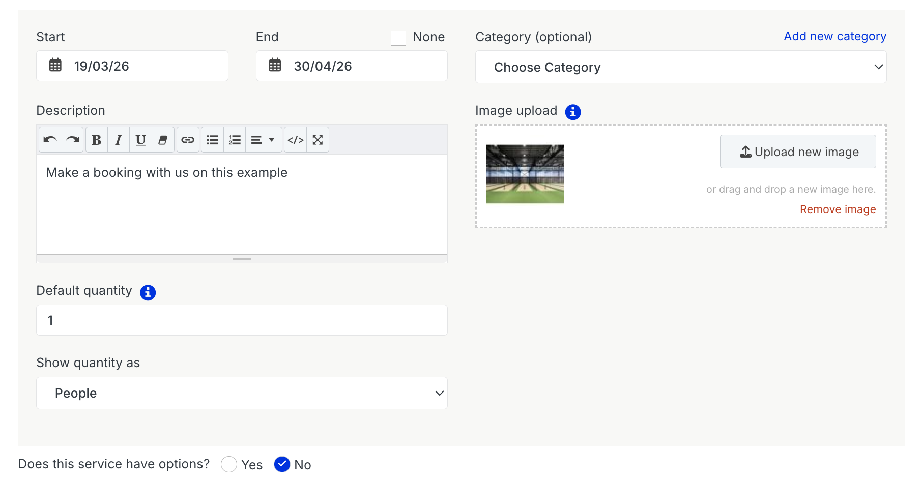 - Options – add variations of this service with different durations,