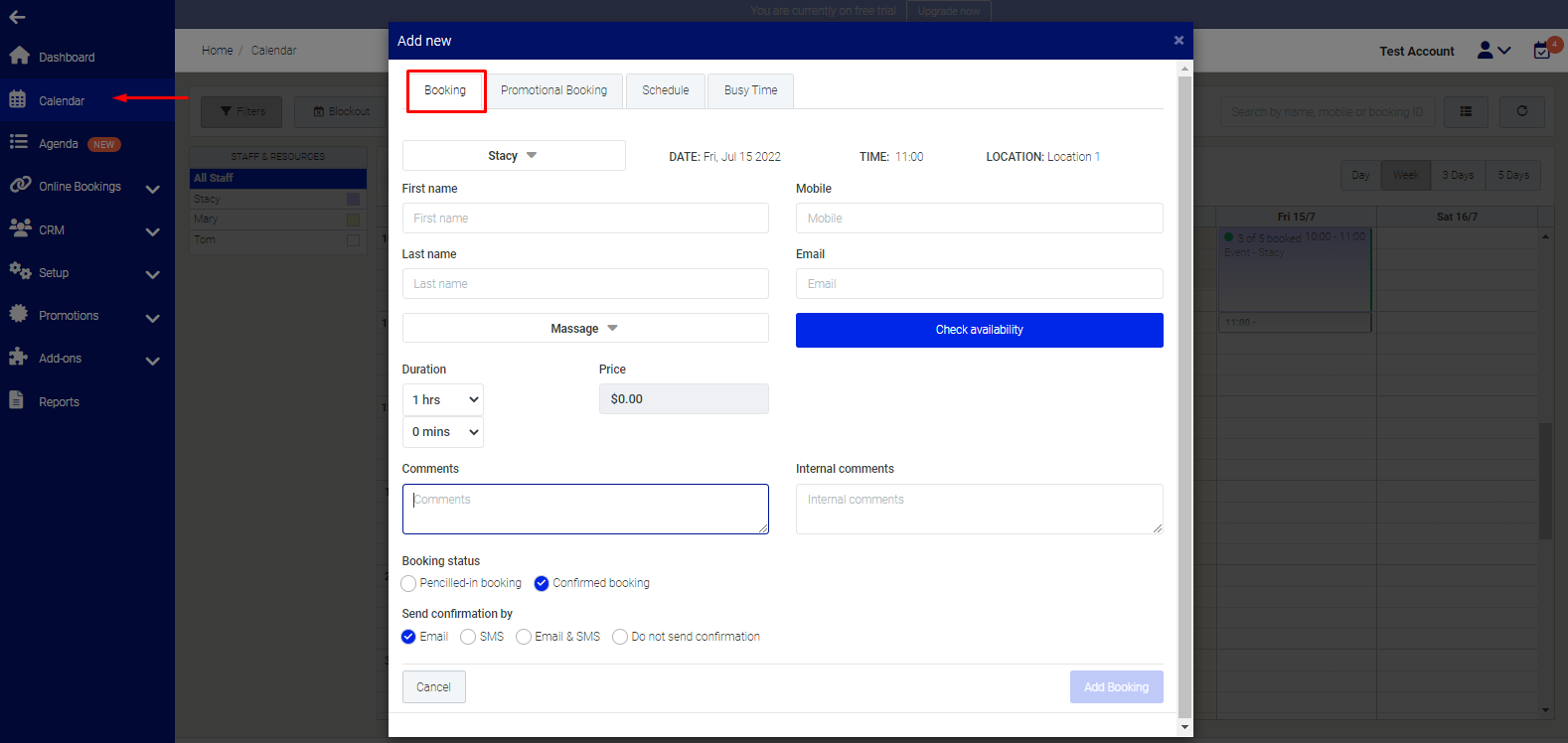 1️⃣ Click + Add Booking at the top left of the Calendar.