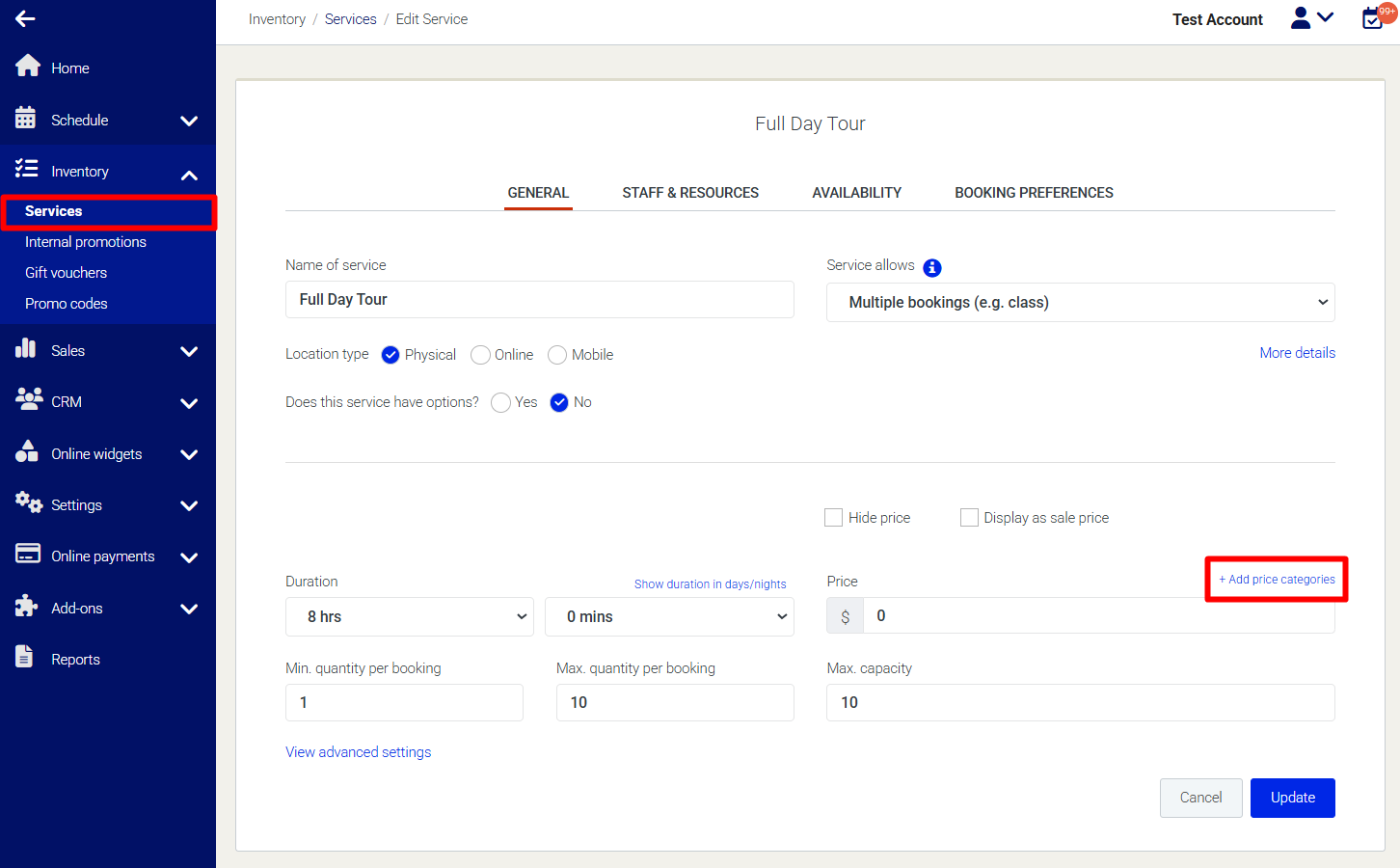 If you use Price Categories to offer different pricing options or packages, you must set the minimum and maximum numbers separately for each price category.