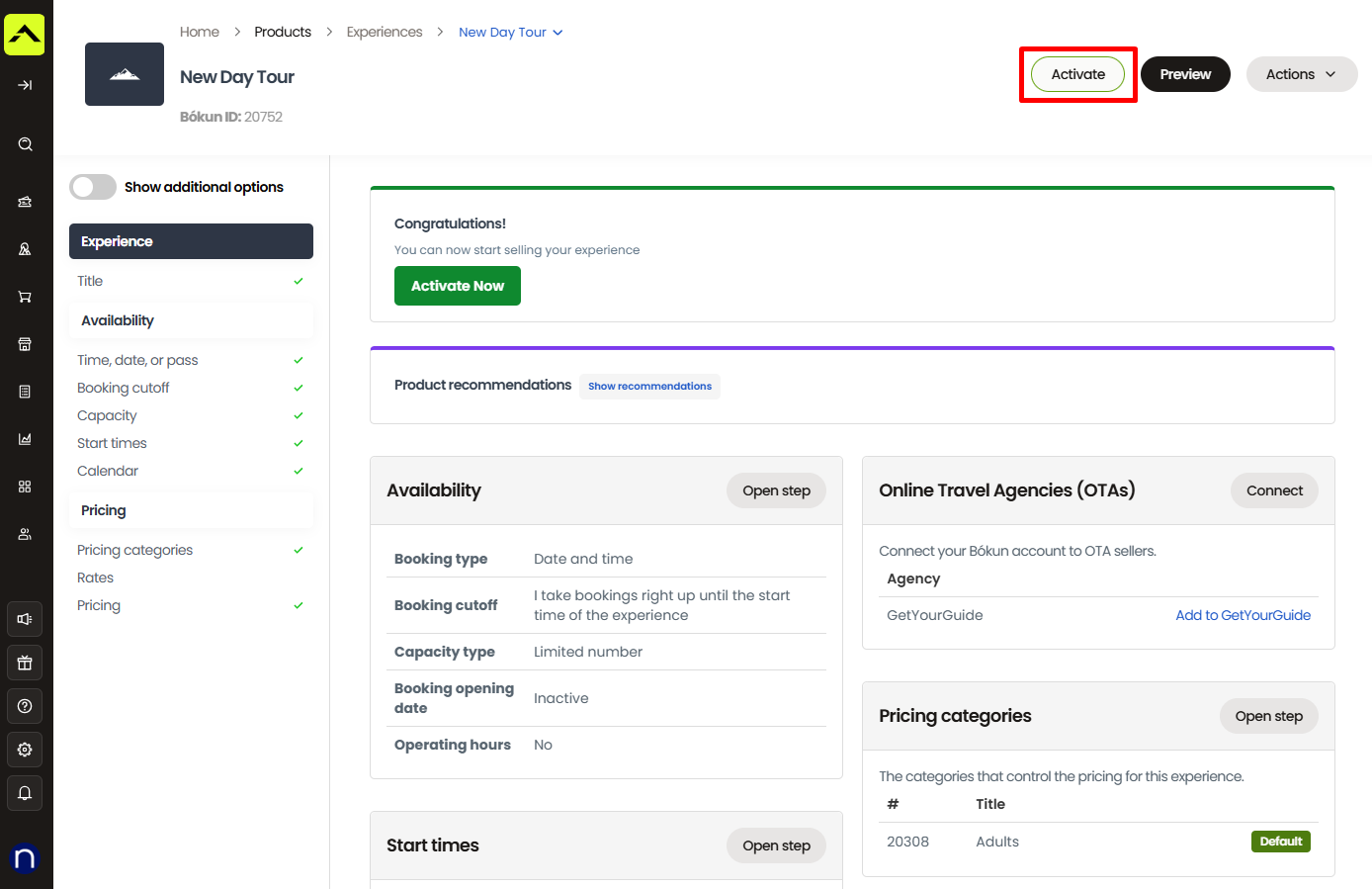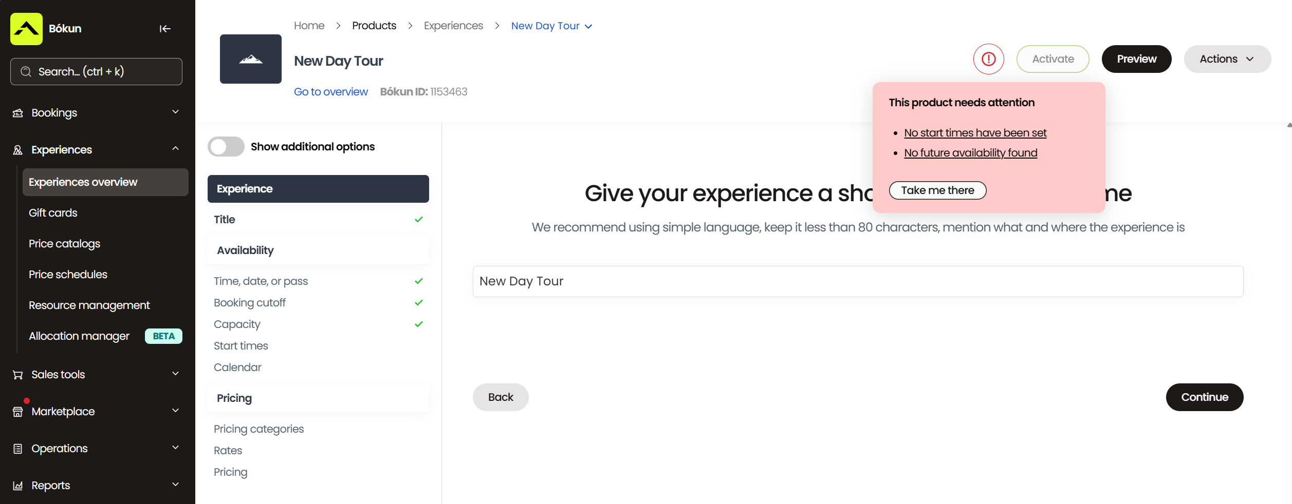 As you work through the setup, Bókun will automatically show if anything important is still missing. If a required step has not been completed, a notification will appear at the top of the page listing exactly what needs attention, such as missing start times or no future availability. Each item in the alert links directly to the relevant section, making it easy to update and correct. This helps ensure your experience is fully configured before you activate it and make it available for bookings.