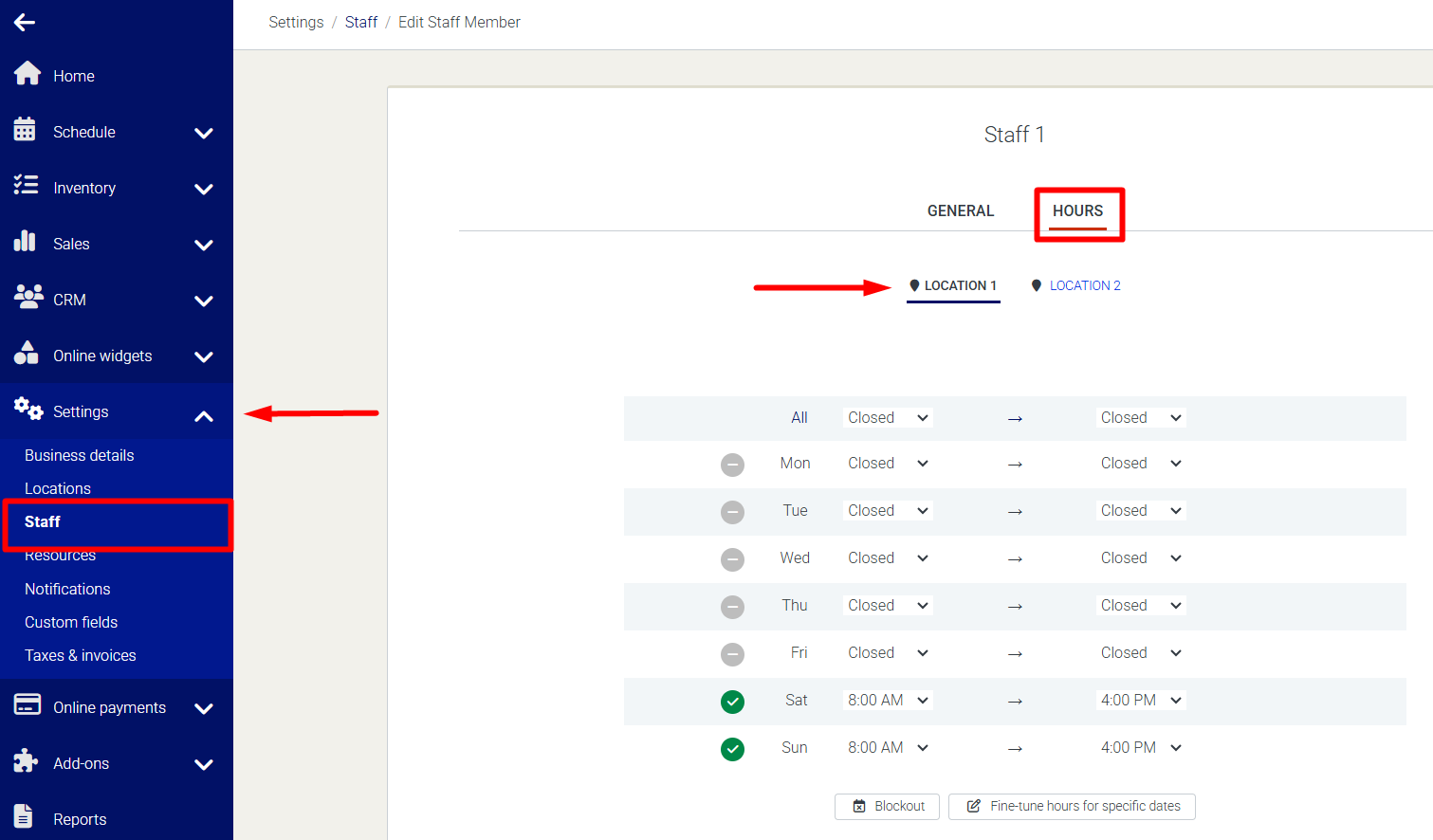 The steps below cover how to fine-tune hours from the Staff Settings. If you prefer to make adjustments while browsing the calendar, you can also fine-tune day-by-day directly from the Schedule > Calendar view.